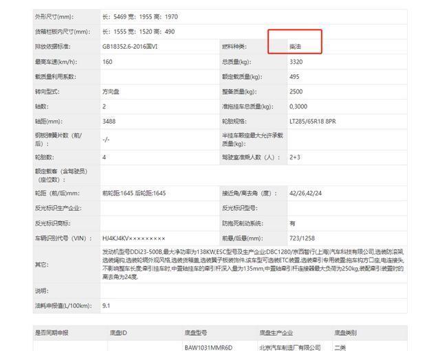 动力配置部分,新车搭载的是来自东风轻型发动机有限公司的2.3T柴油发动机,最大功率为140千瓦,其申报的百公里油耗为9.1L,最高车速为160公里每小时,额定载重量为495千克。