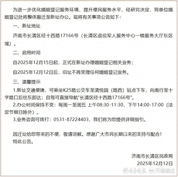 近日,记者从济南市长清区民政局获悉,长清区民政局婚姻登记处整体搬迁至长清区经十西路17166号(长清区退役军人服务中心一楼服务大厅东区域)。