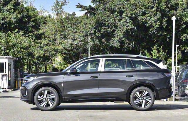 再来看车身侧面部分,侧面线条展现“肌肉雕刻”风格,较短的前后悬与修长引擎盖组合,赋予车辆极强的视觉稳定性。A柱至D柱的曲棍球杆造型镀铬饰条,搭配全黑“极夜悬浮车顶”,营造出时尚的悬浮效果。腰线从前大灯贯穿至车尾,上扬的侧裙腰线与立体曲面勾勒出力量感,轮眉与侧裙的黑色防擦板兼顾实用性与设计感。车身尺寸维持在4949mm×2015mm×1756mm(长×宽×高),轴距2980mm,定位中大型SUV。