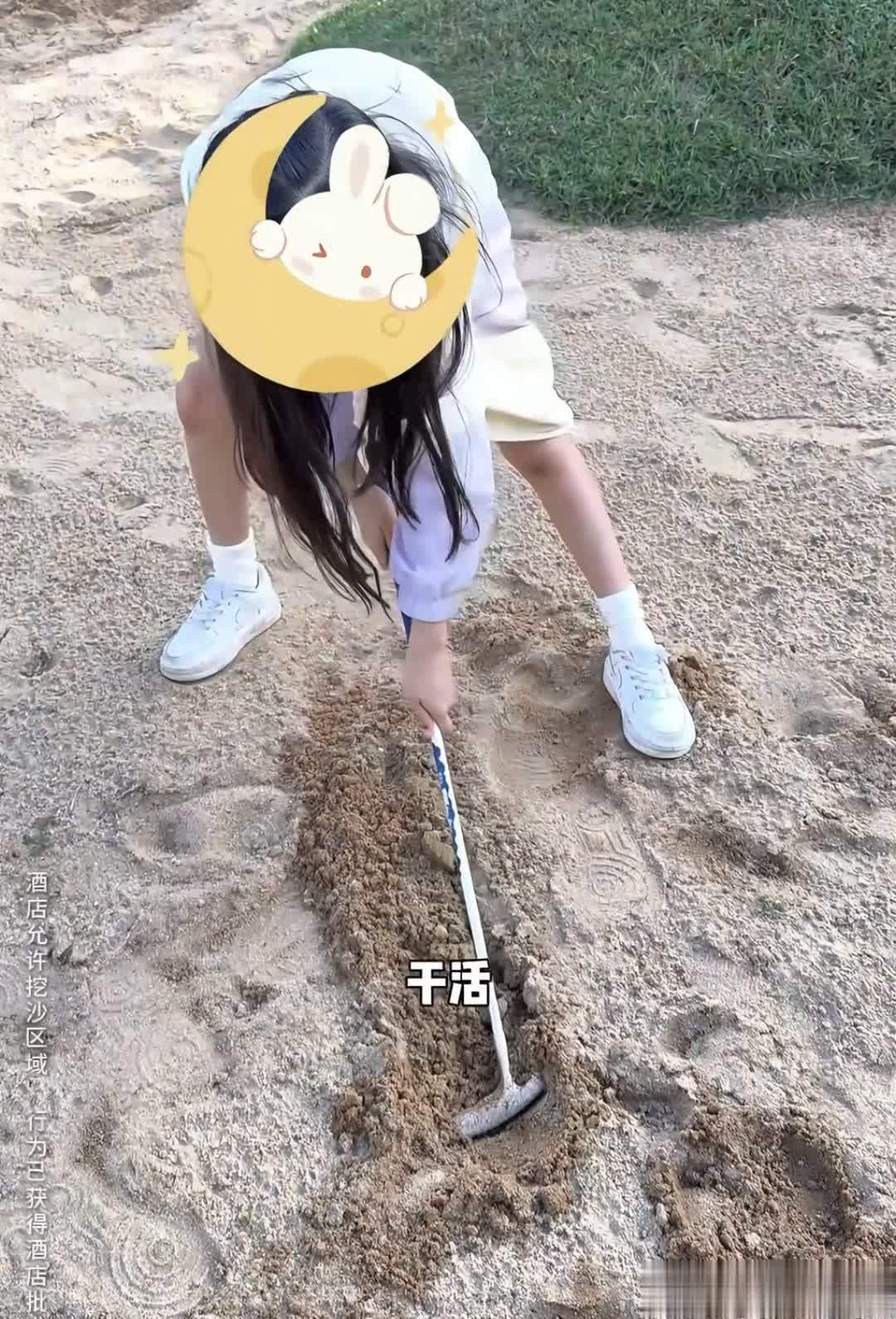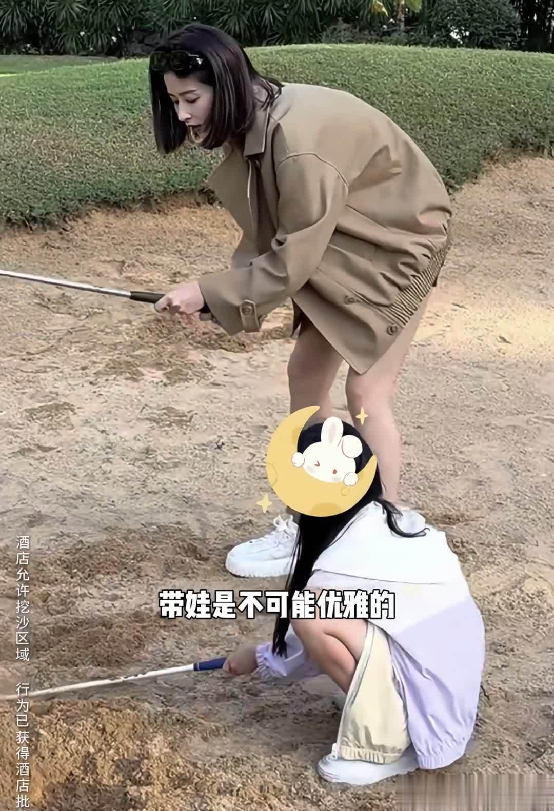 颖儿非常宠女儿,非但没有阻止孩子挖沙,还在旁边陪同闹腾,带孩子的同时,自己也放松了。