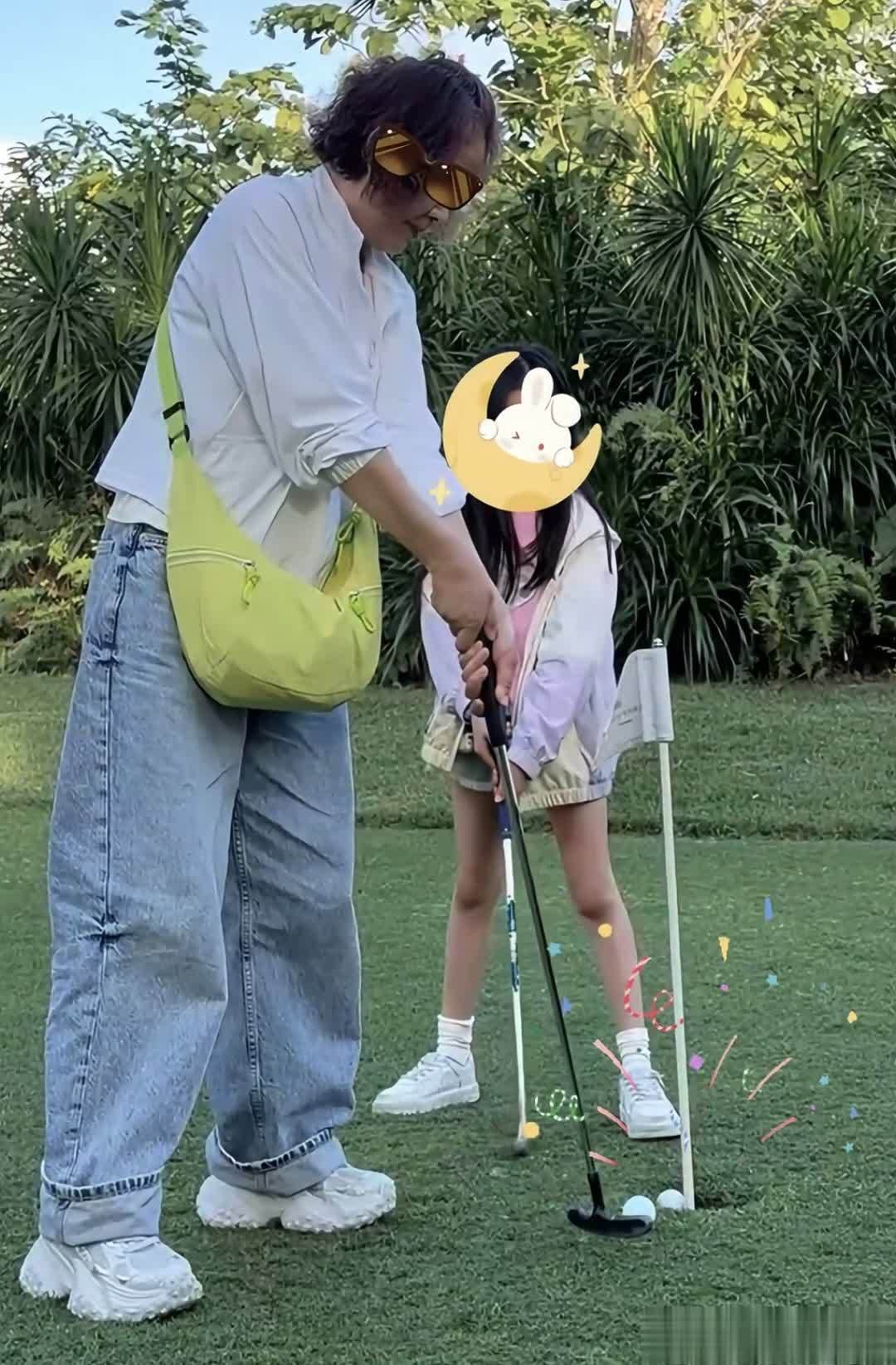 颖儿一家人都是瘦高个,连姥姥都那么苗条,而且颖儿妈妈打扮很年轻,白色外套配宽松浅色牛仔裤,还加上一双厚底鞋,整体休闲又减龄,身上背着荧光色包包更添几分亮眼。小月亮拉着姥姥陪她打高尔夫,祖孙俩玩得超开心。
