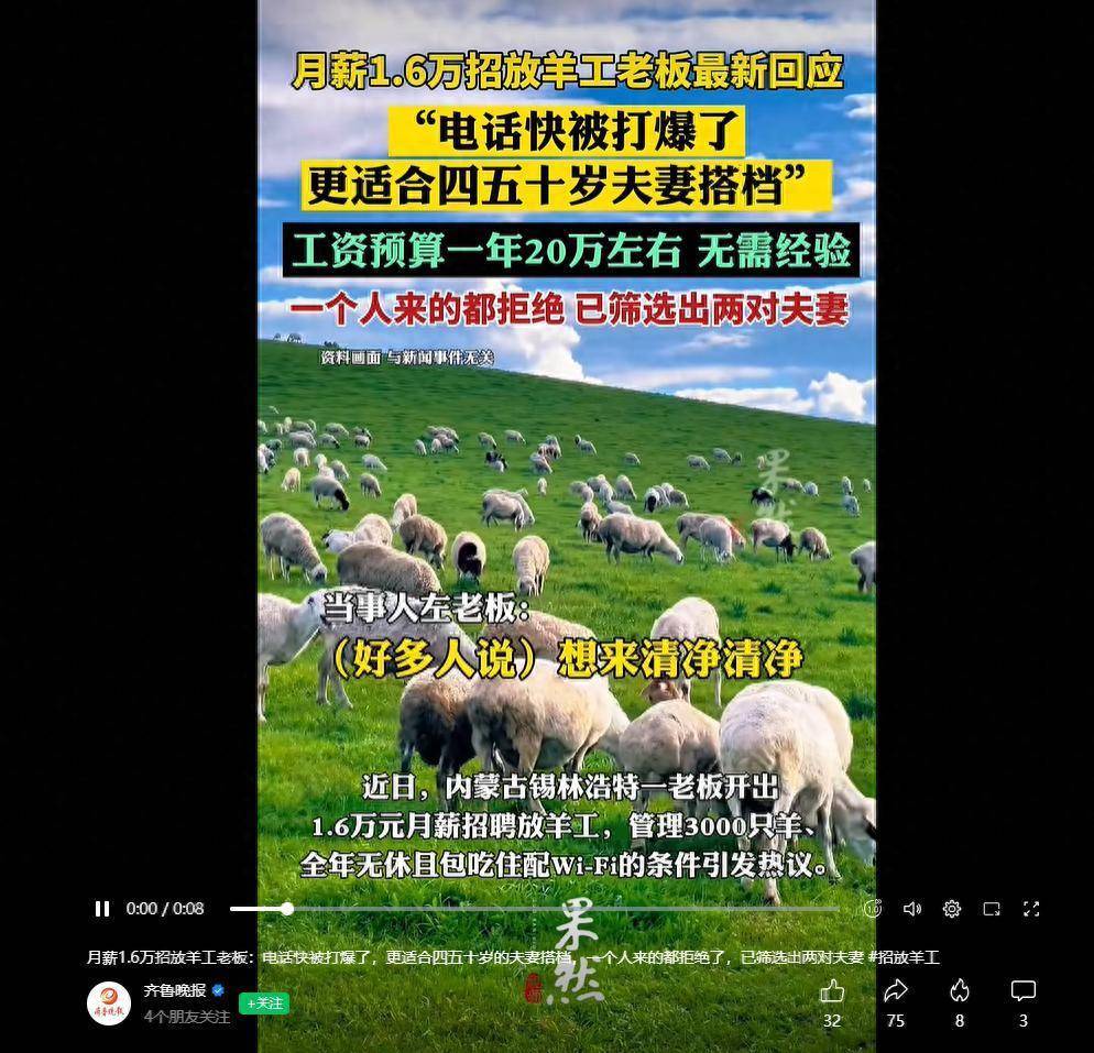 近日,内蒙古锡林浩特一食品公司老板公开招人:工作地点位于内蒙古牧区,牧场面积三万多亩,管近3000只羊,引发广泛关注。